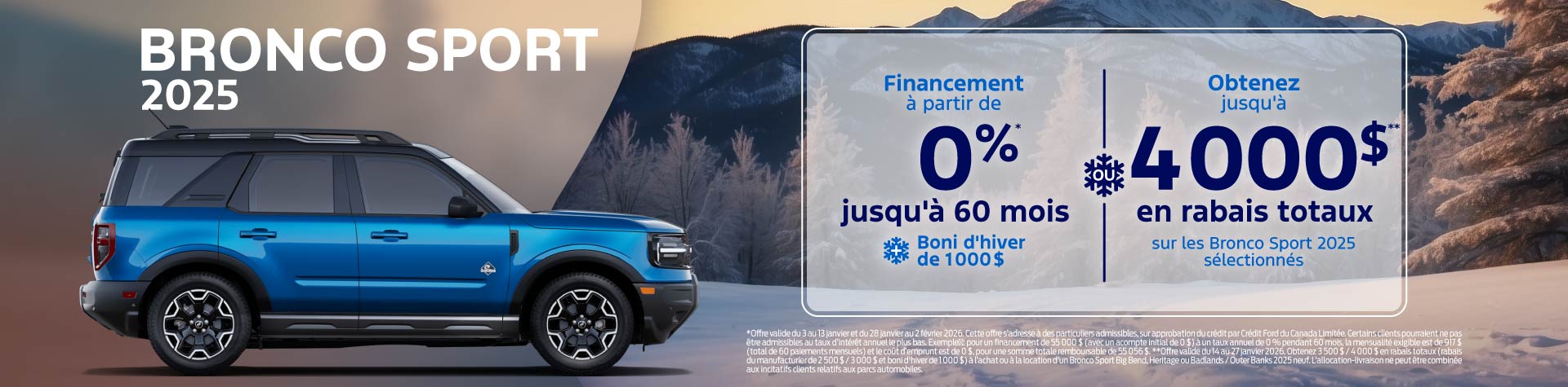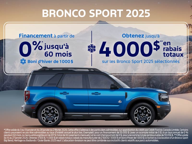 Sous le capot, le Bronco Sport 2025 propose deux motorisations puissantes : un moteur EcoBoost de 1,5 litre développant 181 chevaux et un moteur EcoBoost de 2,0 litres offrant 250 chevaux. Ces moteurs sont couplés à une transmission automatique à 8 vitesses. Parce qu’il est un véritable aventurier, le Bronco dispose d’un rouage intégral de série, jumelé au système G.O.A.T. (Goes Over Any Terrain) qui, selon les versions, offre jusqu'à 7 modes de conduite. De plus, la version Badlands est équipée de la suspension HOSS (High-Performance Off-Road Stability Suspension) pour une performance optimale en tout-terrain.