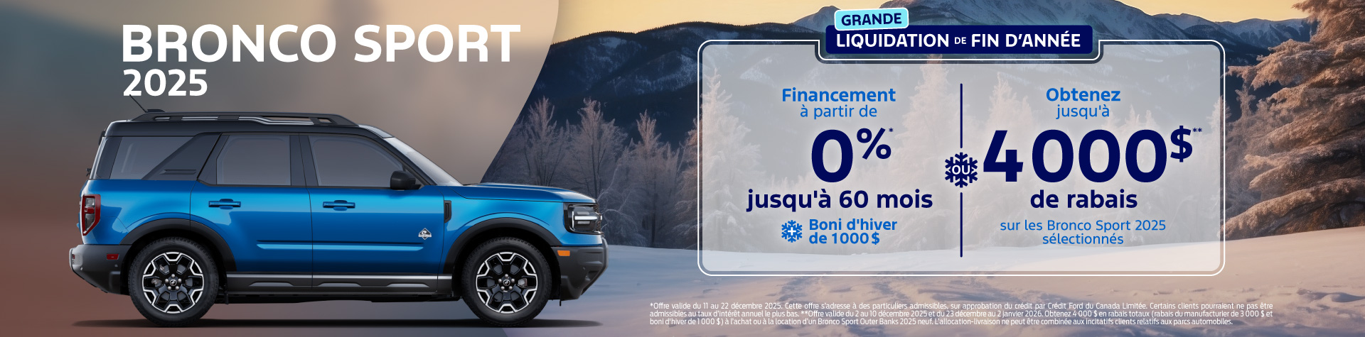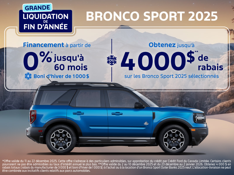 Sous le capot, le Bronco Sport 2025 propose deux motorisations puissantes : un moteur EcoBoost de 1,5 litre développant 181 chevaux et un moteur EcoBoost de 2,0 litres offrant 250 chevaux. Ces moteurs sont couplés à une transmission automatique à 8 vitesses. Parce qu’il est un véritable aventurier, le Bronco dispose d’un rouage intégral de série, jumelé au système G.O.A.T. (Goes Over Any Terrain) qui, selon les versions, offre jusqu'à 7 modes de conduite. De plus, la version Badlands est équipée de la suspension HOSS (High-Performance Off-Road Stability Suspension) pour une performance optimale en tout-terrain.